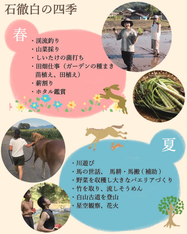 | 集合場所 | 岐阜県郡上市白鳥町石徹白 VIDA Garden 拠点 基本的に、現地にて受け入れたいと思っておりますが、公共交通機関などで来ていただき、車でお迎えをすることなども可能です◎ |