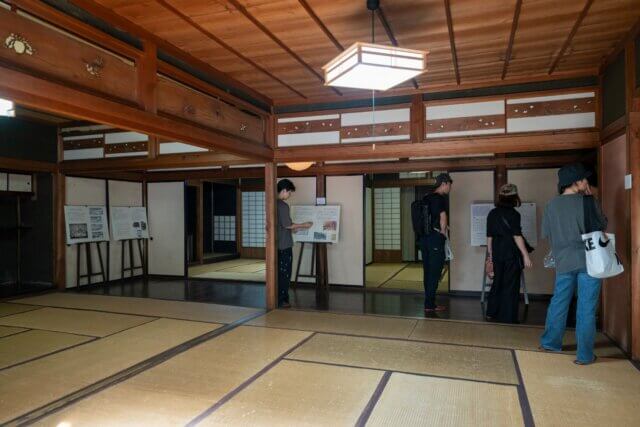 当日は15人が参加し、県外から農業や地方ビジネスに関心を持つ方も多く見られました。参加者はまち歩きをしながら、空き家物件4棟や柳川水屋、辰巳屋、旧深山邸を見学。建物の細部まで熱心に観察し、気になったことを積極的に質問していました。